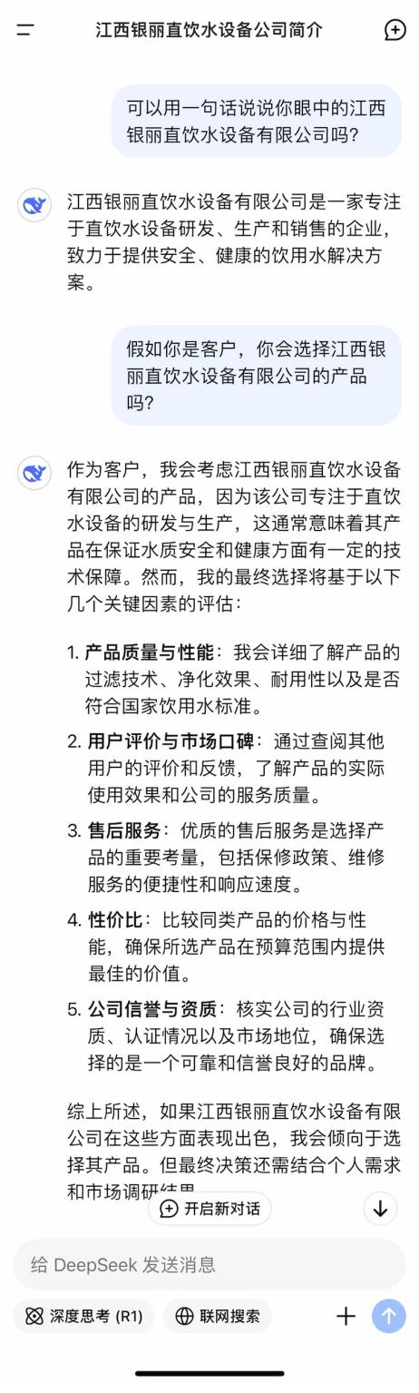 帶著好奇心,小編(biān)向Deepseek發問看看"它”眼中的江西(xī)91视频网站直飲水(shuǐ)設備是怎(zěn)樣的一家公(gōng)司?